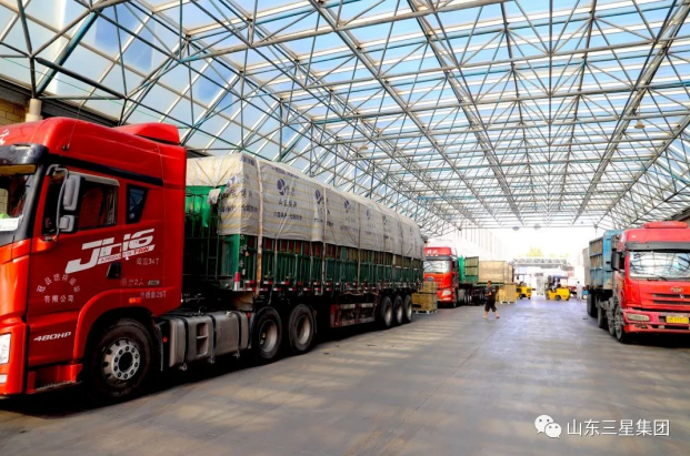 ▲來自各地的運輸車輛正等待裝車,長壽花全系列產品由此馳往全國市場。
